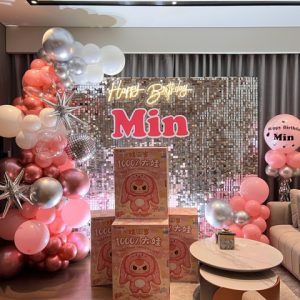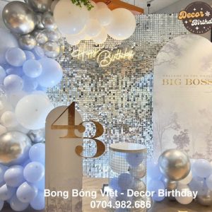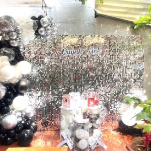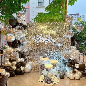 “Trang trí background rèm sequin sinh nhật giúp không gian lộng lẫy, sang trọng. Kết hợp bong bóng, chữ LED, bàn tiệc ngọt tạo điểm nhấn đẹp mắt và độc đáo.”